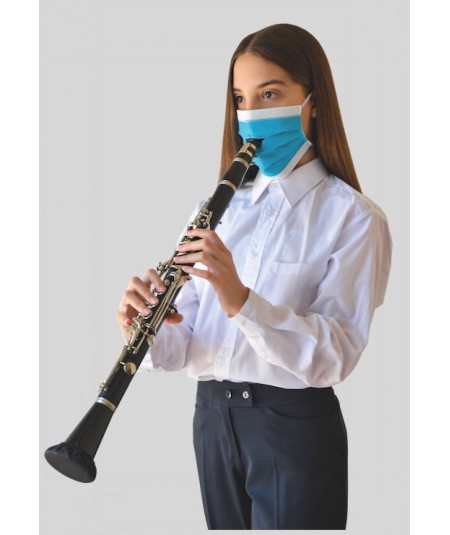 Aunque los estudios más recientes, incompletos por su urgencia, realizados sobre instrumentos de viento hablan de la mínima transmitancia de saliva más allá de los 50-70 cm más cercanos al intérprete, estamos seguros que si la nueva normalidad trae aparejado el uso de mascarillas para la población, no podían quedarse apartados nuestros instrumentos de viento, a la sazón, prolongación de nosotros mismos. Precisamente por los resultados de esos estudios y lo que aventuran, hemos diseñado nuestra mascarilla para instrumentos de viento - clarinete, corno inglés, fagot, requinto, saxo sopranino - adaptable a una protección parcial y en bolsas de 6 unidades (1 sola mascarilla, 70% de protección o 3 mascarillas, protección superior al 90% tras veinticinco lavados de acuerdo con las especificaciones marcadas en su etiqueta). Además, estas mascarillas han sido probadas en un estudio de grabación para detallar su impacto sobre los sonidos emitidos por instrumentistas y cantantes. El impacto es mínimo y prácticamente imperceptible para el oído humano.